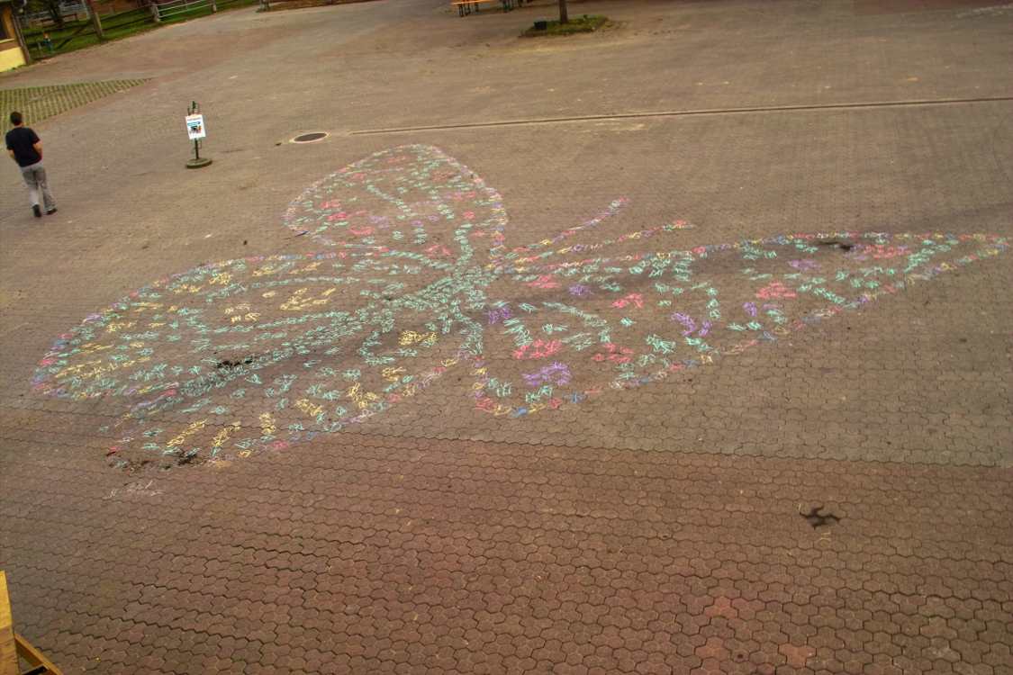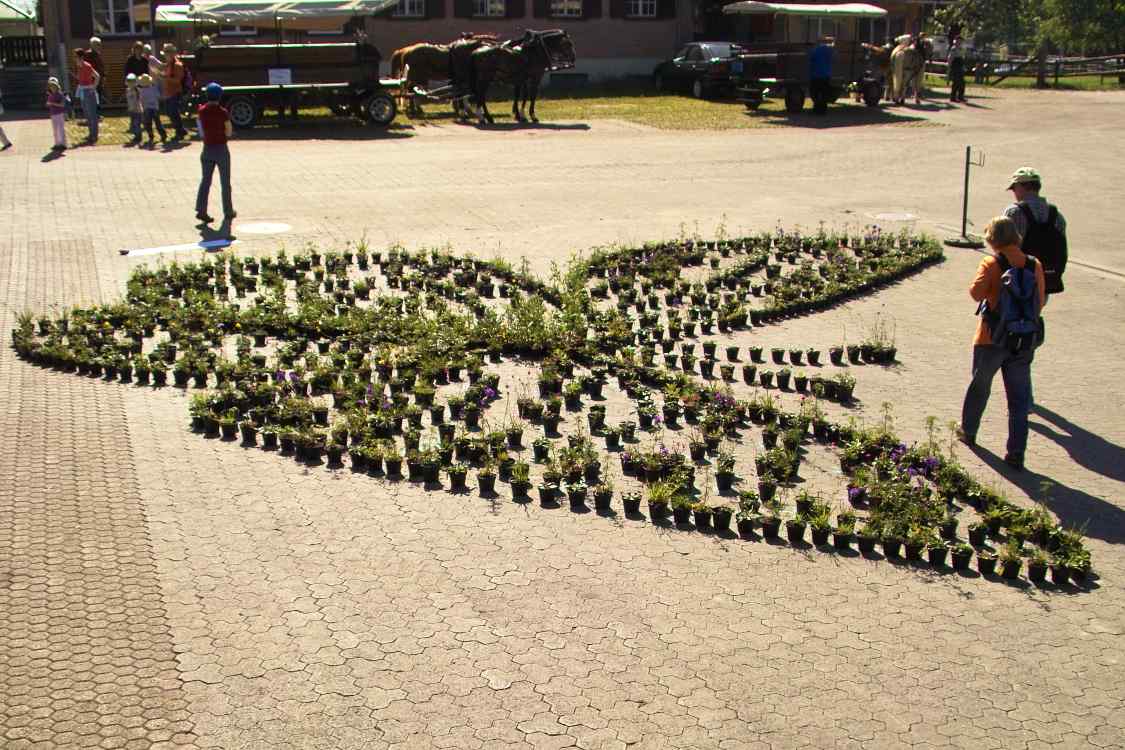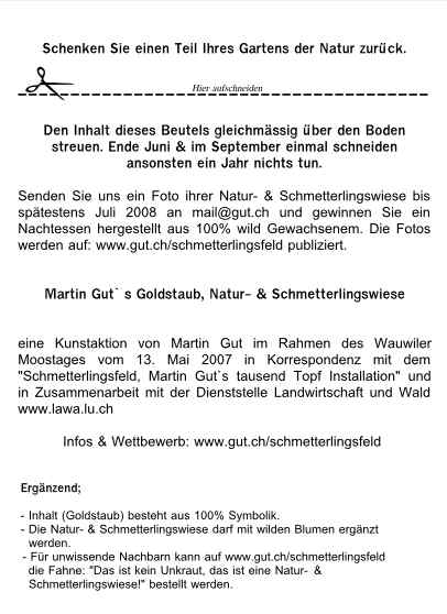 In collaboration with the agency for agriculture and forest Martin Gut implemented the Butterfly Field as project of art in action in two acts and four dimensions. His installation contained 1`000 pots for wildflowers which were sold seperately at the Wauwiler Moostag - each pot left a flying buterfly behind which was symbolically drawn on the floor and contained some gold dust with the invitation to donate parts of land back to nature.