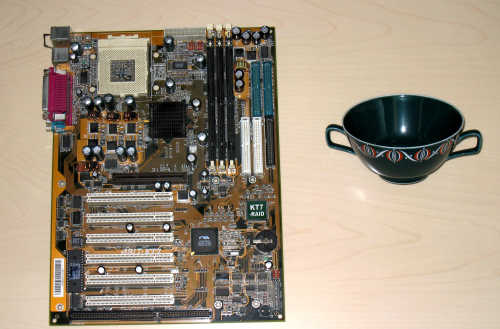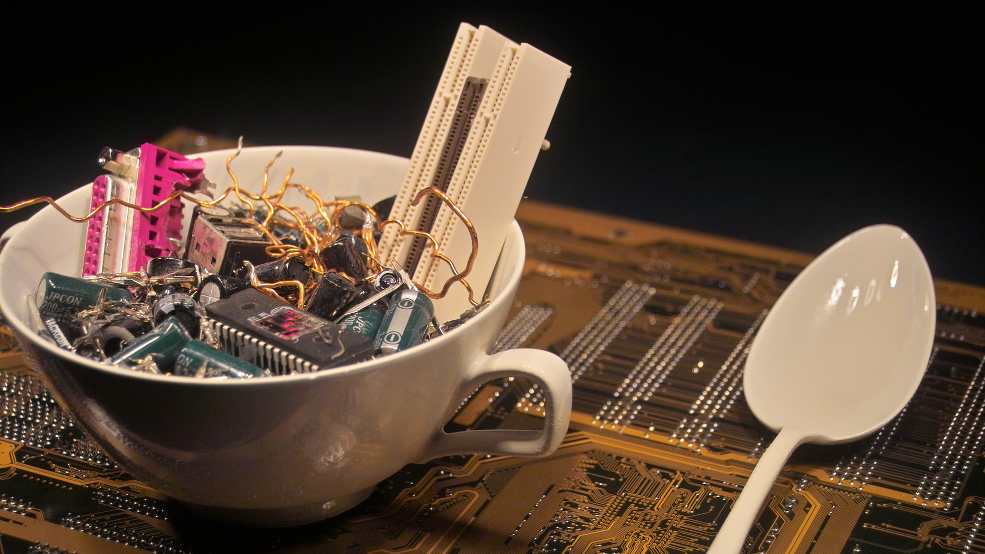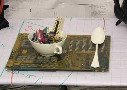 Material used: a motherboard, synthetic resin varnish, a spoon, a cup