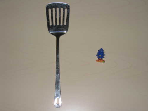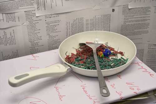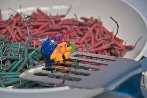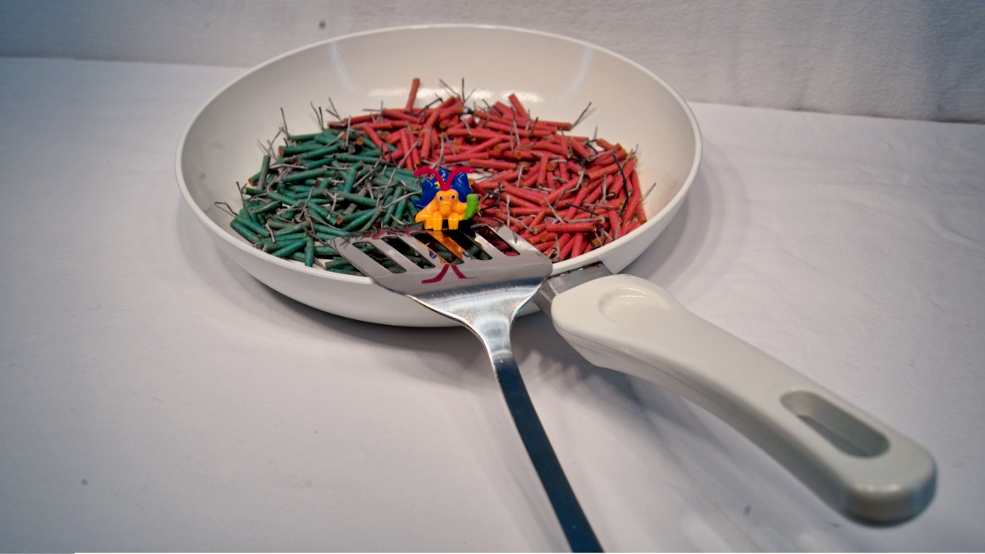 Material used: a frying pan, varnish paint, firecrackers, a toy for children, a frying scoop made of metal