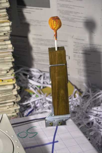 Material used: a metal bracket, a clothespin, screws, acrylic paint, a lollypop