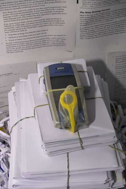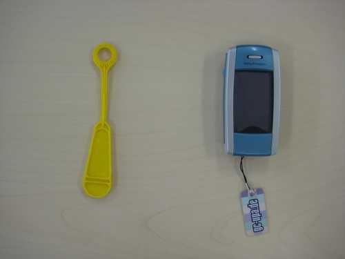 Material used: a mobile phone, a condom, a toy used to make soap bubbles